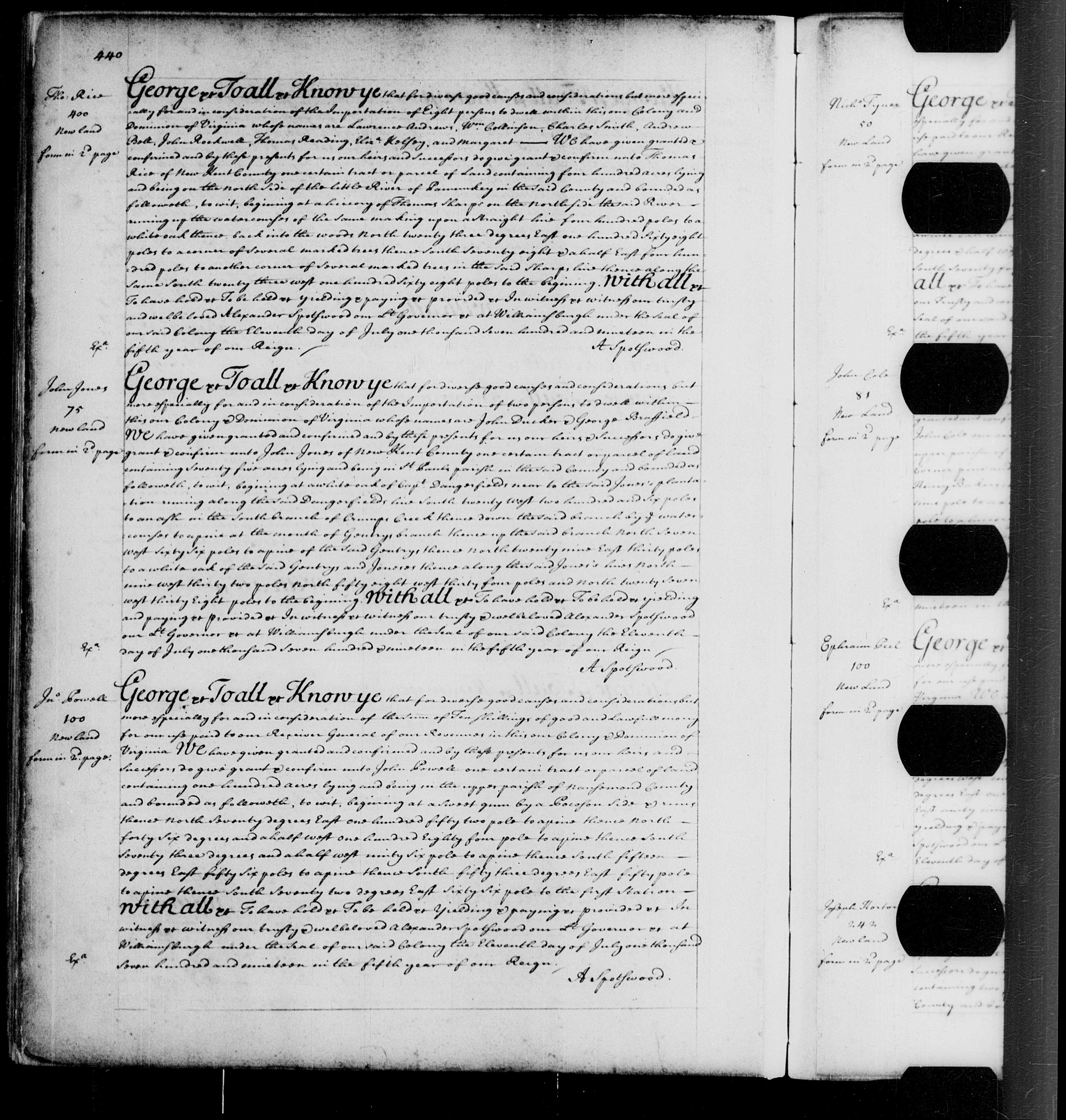 1719-07-11 grant to Thomas Rice of New Kent Co VA for transporting 8 persons whose names are Lawrence Andrews, Wm Collinson, Charles Smith, Andrew Ball, John Rockwell, Thomas Reading, Eliza Kelsey, and Margaret ____; 400 acres on the north side of the little River of Pamunkey in the said county...
